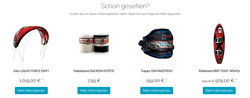 Am Ende der Detailseite von Artikeln werden unter der Überschrift „Schon gesehen?“ standardmäßig vier Artikel empfohlen und mit Bild, Titel und Preis angezeigt. Der Kunde kann sich zu einem dieser Artikel auf dessen Detailseite informieren, zu der er über die Schaltfläche Mehr Informationen gelangt.