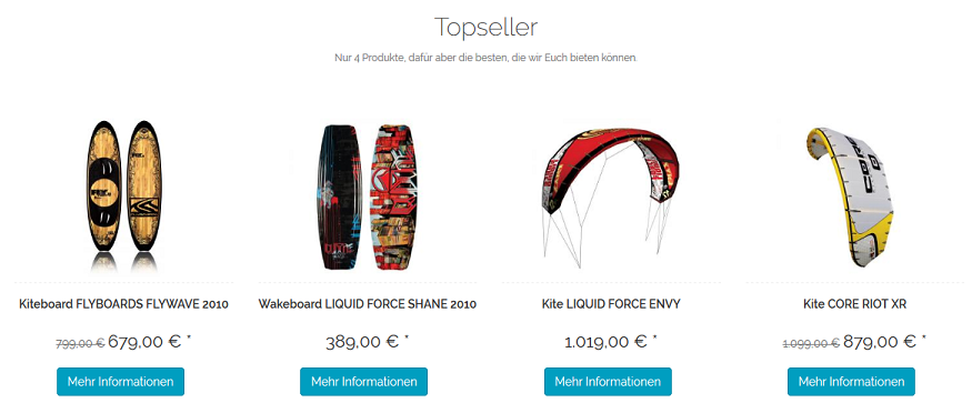 Weiter unten auf der Startseite werden dem Kunden die meistverkauften Artikel des Shops angezeigt. Die Empfehlungen werden durch die OXID Personalisierungsoption bereitgestellt und in einem Widget dargestellt. Auch hier zeigt das econda Empfehlungswidget standardmäßig vier Artikel nebeneinander mit Bild, Titel und Preis des Artikels. Es kann die Detailseite eines Artikels aufgerufen werden. Der Artikel kann jedoch nicht direkt in den Warenkorb gelegt werden.