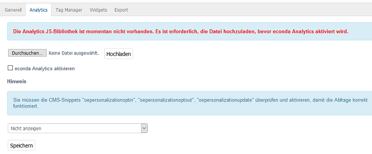 Damit econda Analytics in Ihrem OXID eShop aktiviert werden kann, muss die Analytics JS-Bibliothek in den Shop integriert werden. Die Schaltfläche Durchsuchen… öffnet einen Dateidialog, in dem Sie die von econda bereitgestellte Datei auf Ihrem Rechner auswählen können. Wenn Sie nun die Schaltfläche Öffnen drücken, wird der Dateinamen direkt übernommen und die Datei kann anschließend mit der Schaltfläche Hochladen in den Shop übertragen werden.