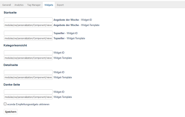 Um Zugriff auf den Recommendation-Service zu haben, benötigen Sie die IDs der in econda konfigurierten Empfehlungswidgets. Tragen Sie diese in das Feld Widget-ID der Startseite, der Kategorieansicht, der Detailseite und der Danke-Seite ein. Das Feld Widget-Template enthält den relativen Pfad zum Template, welches die Anzeige der Artikel steuert. Standard-Template ist Component/views/list.ejs.html.