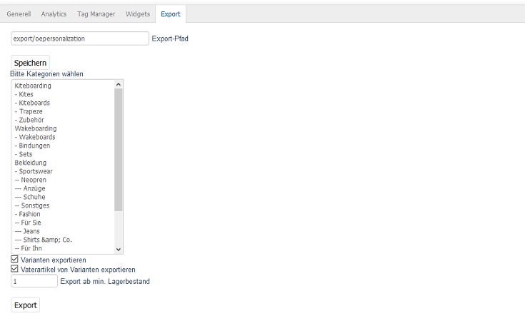 Es werden immer alle Artikel einer Kategorie exportiert. Welche Kategorien beim Export einbezogen werden, kann in dem angezeigten Kategoriebaum durch Markieren mit der linken Maustaste festgelegt werden. Eine Mehrfachauswahl ist mit gedrückter Strg-Taste bzw. Hochstell-Taste möglich. Mit Strg+a lassen sich alle Kategorien auf einmal markieren.