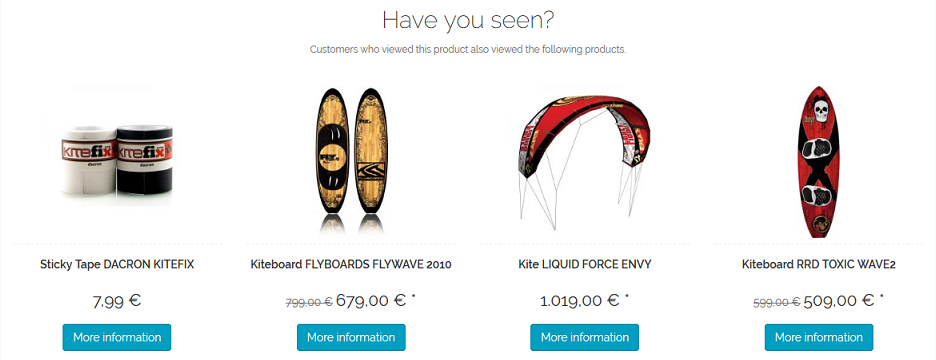 By default, four products will be recommended and displayed with an image, title and price under the heading “Have you seen?” at the end of the product details page. The customer can learn more about any of these products on its details page, which can be accessed by clicking on More Information.