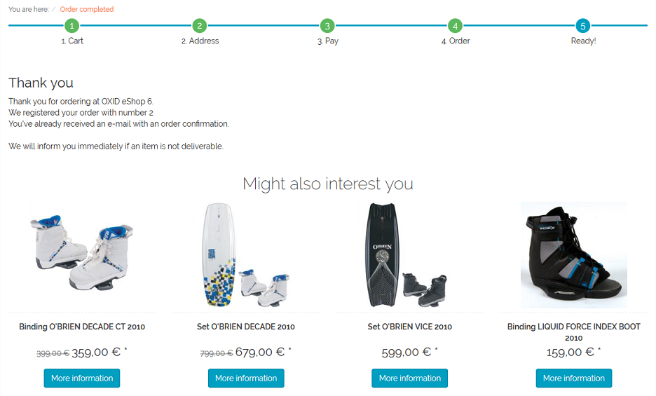 If the customer placed an order in the shop, a thank-you page is displayed at the end of the ordering process. The order number will also be shown along with the notification of the order confirmation e-mail. When the OXID eShop personalisation option is activated, the thank-you page will suggest four products by default that could also be interesting for the customer.
