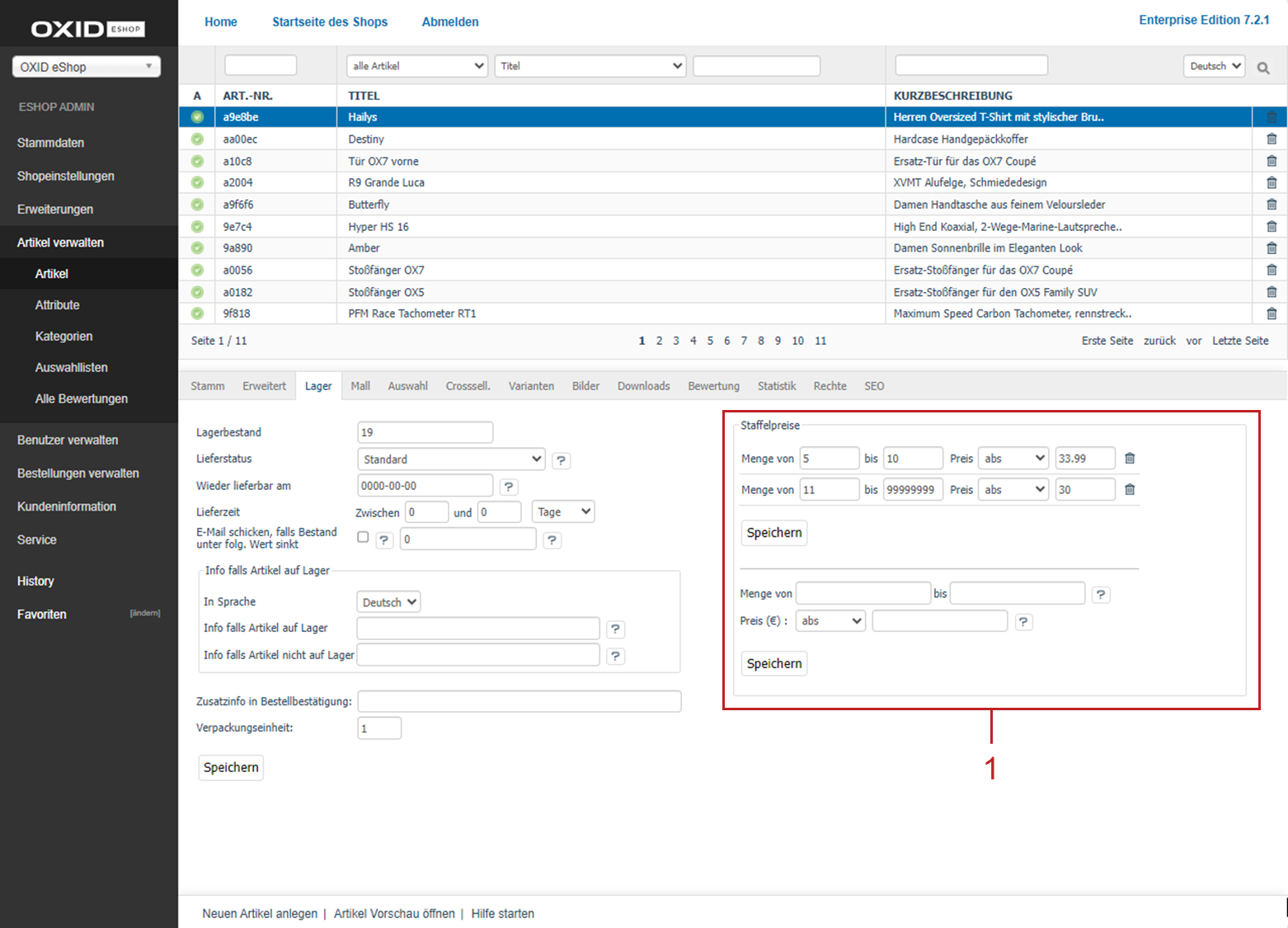 Legen Sie auf der Registerkarte Lager unter Staffelpreise eine Mengenstaffel sowie den dazugehörigen Preis fest (Abb.: Staffelpreise festlegen, Pos. 1).