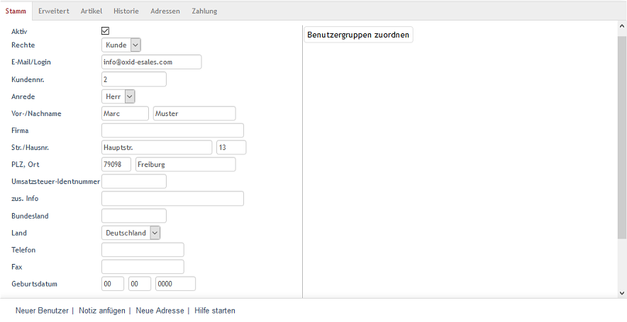 Der Shop vergibt beim Erstellen eines Benutzers eine fortlaufende Kundennummer. Standardmäßig wird mit der 1 begonnen. Ändern Sie die Kundennummer des zuletzt erstellten Benutzers, wird ab dessen Kundennummer weitergezählt. Im Feld Kundennr. sind ausschließlich numerische Werte erlaubt. Davon abweichende Eingaben führen dazu, dass die Kundennummer auf Null gesetzt wird.