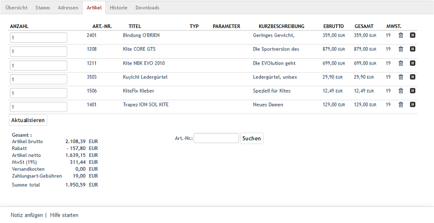 Eine Funktion erlaubt Ihnen allerdings auch, neue Artikel in die Bestellung aufzunehmen. Unter Angabe der Artikelnummer kann nach einem bestimmten Artikel gesucht werden. Legen Sie die Menge für den gefundenen Artikel fest und betätigen Sie die Schaltfläche Artikel hinzufügen. Der Artikel wird in der eingetragenen Menge zu einer neuen Bestellposition.