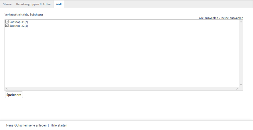 Auf der Registerkarte Mall werden die Verknüpfungen einer Gutscheinserie zu Subshops und Supershops verwaltet. Bei Multishops ist die Anzeige leer, da sie ohne eine derartige Verknüpfung Gutscheinserien aus allen Shops übernehmen und anzeigen.