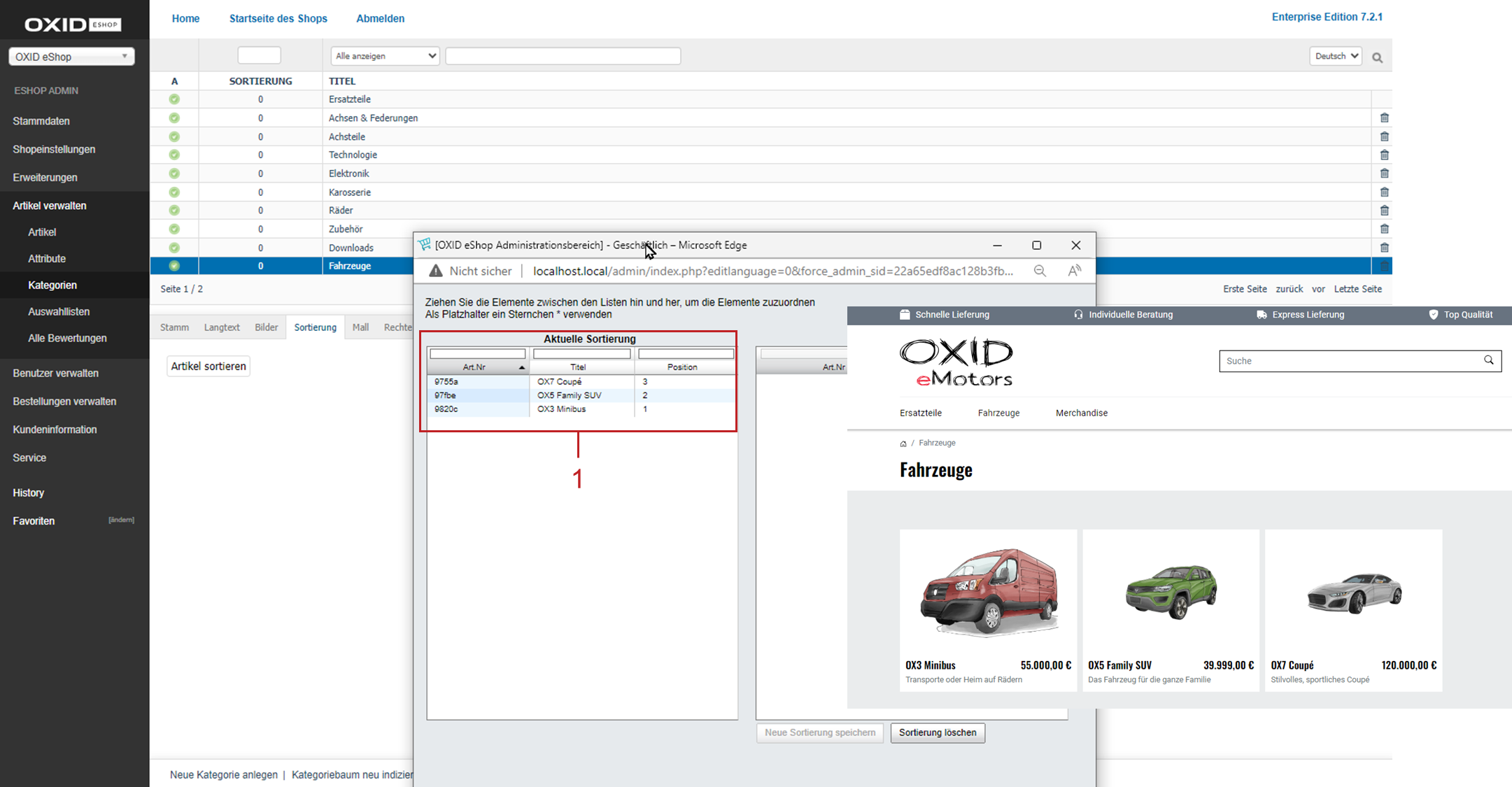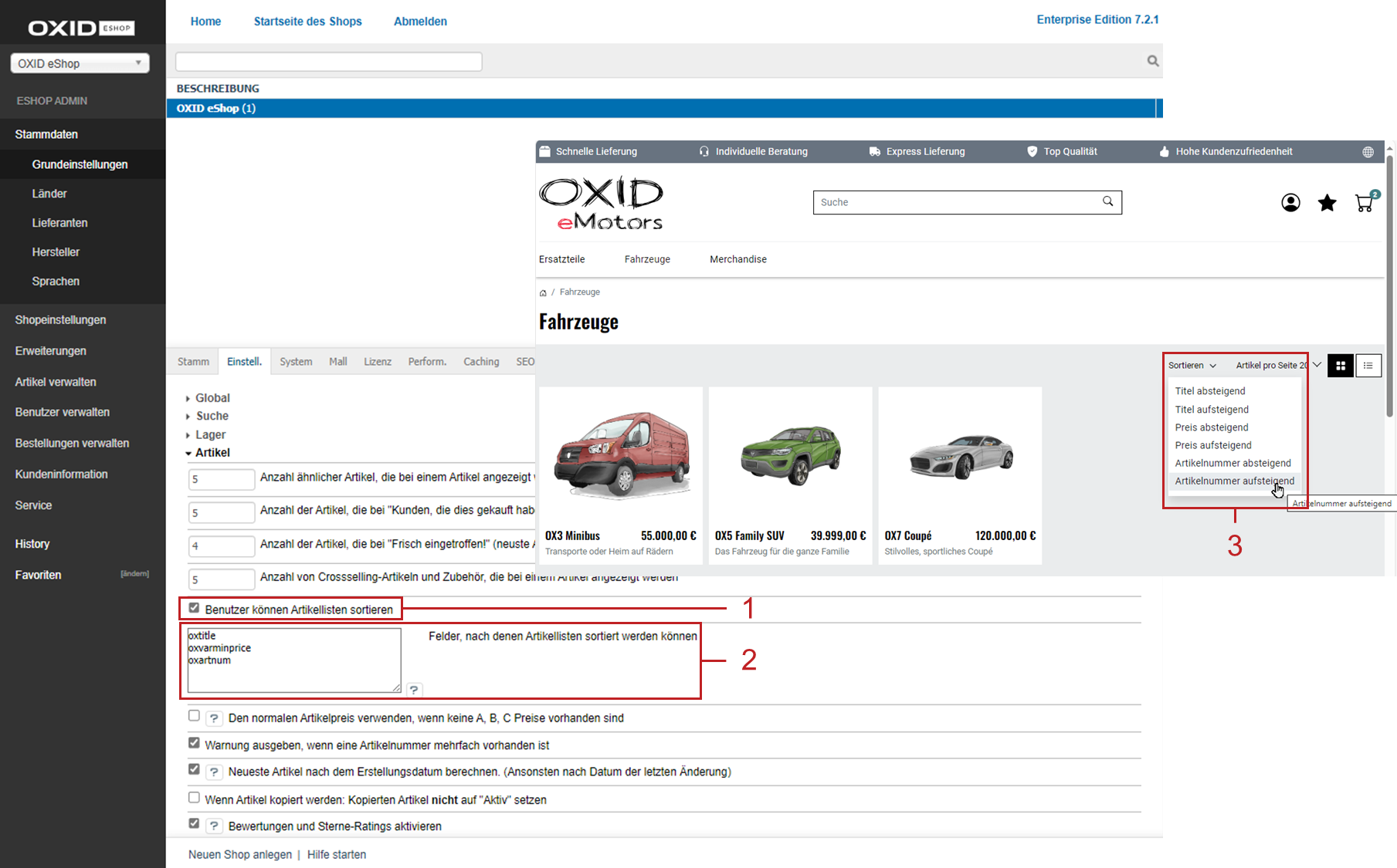 Dafür haben wir in den Stammdaten den standardmäßig eingetragenen Feldern oxtitle und oxvarminprice das Feld oxartnum hinzugefügt (Abb.: Kundenseitiges Sortieren konfigurieren, Pos. 2).