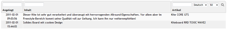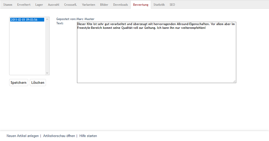 Auf dieser Registerkarte können die Bewertungen zu einem Artikel eingesehen, kleine Rechtschreibfehler korrigiert oder eine Bewertung notfalls auch gelöscht werden.