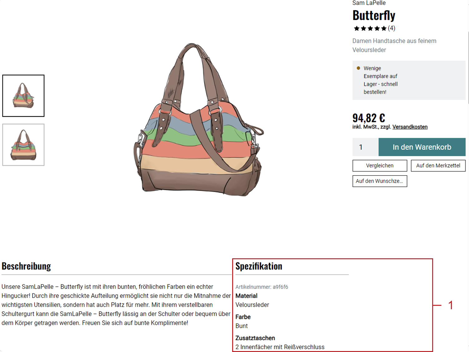 Die Attribute erscheinen unter Spezifikation (Abb.: Attribute auf der Detailseite anzeigen, Pos. 1).