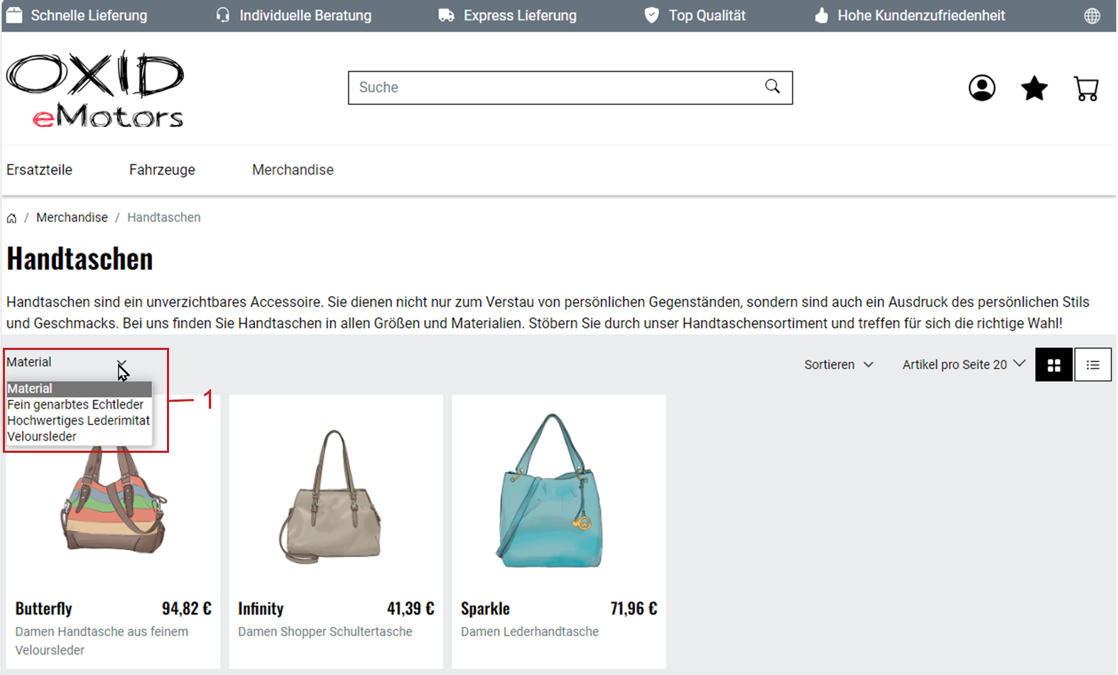 Um das Filtern von Produkten zu ermöglichen, blenden Sie in der Kategorie-Übersicht des Shops eine Dropdown-Liste aller Werte des Attributes ein (Abb.: Filter mit Attributwerten anzeigen, Pos. 1).