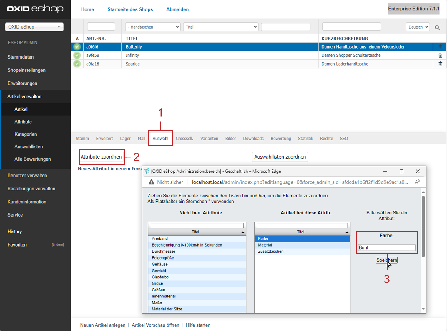 Wählen Sie Attribute zuordnen (Abb.: Benutzerdefiniertes Attribut zuweisen und Wert festlegen, Pos. 2).