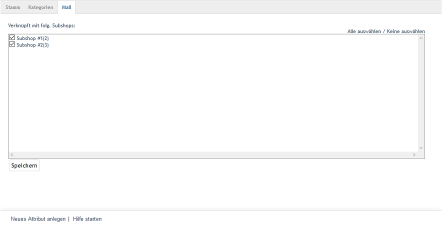 Auf der Registerkarte Mall werden die Verknüpfungen des Attributes zu Subshops und Supershops verwaltet. Multishops übernehmen keine Attribute aus anderen Shops.