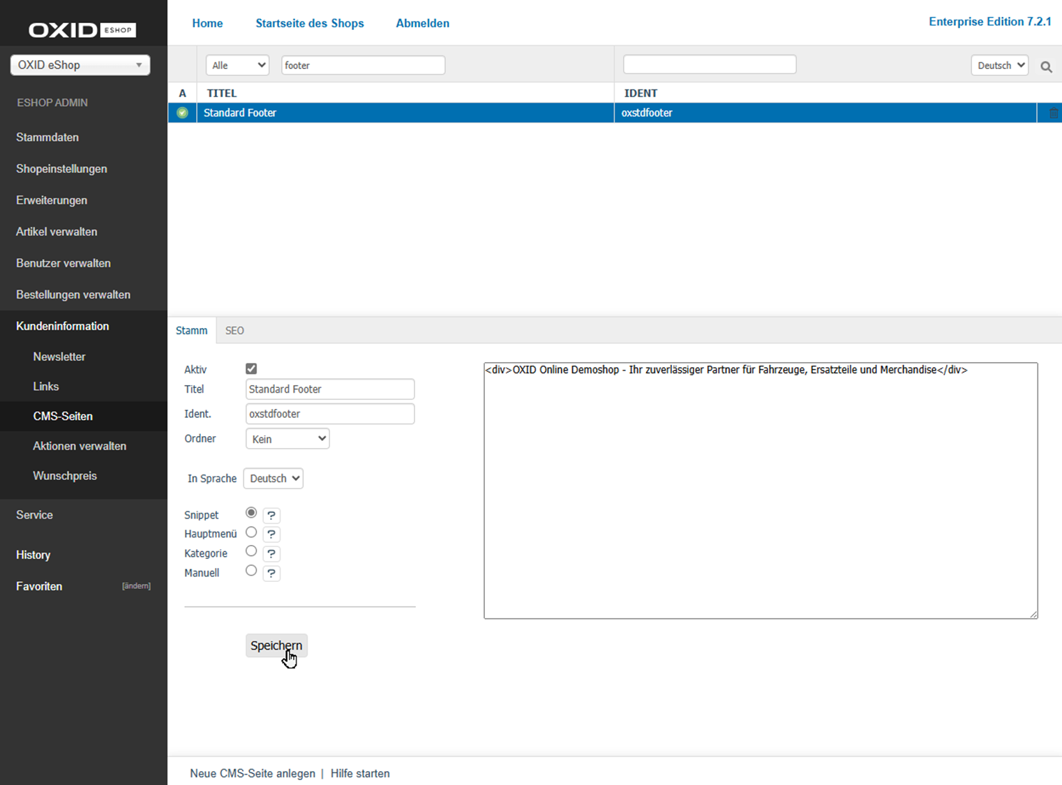 Inhalte: aktive CMS-Seite, Titel, Ident, Ordner für CMS-Seiten, Snippet, Hauptmenü, Kategorie, Link in Kategorienavigation, manuell, inkludierte CMS-Seite, Inhalt der CMS-Seite, Editor, WYSIWYG, HTML-Code