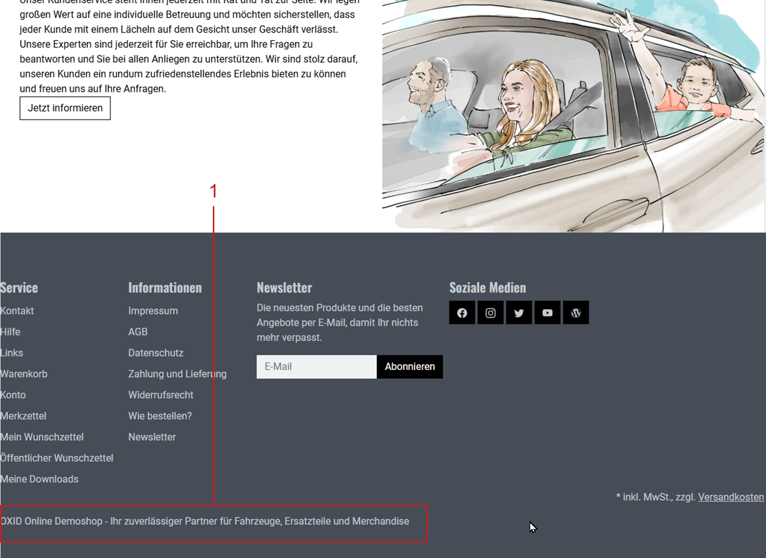 Im unteren Bereich des Shops (Footer) erscheint beispielsweise der über eine CMS-Seite definierte Slogan (Abb.: Footer im Frontend, Pos. 1):