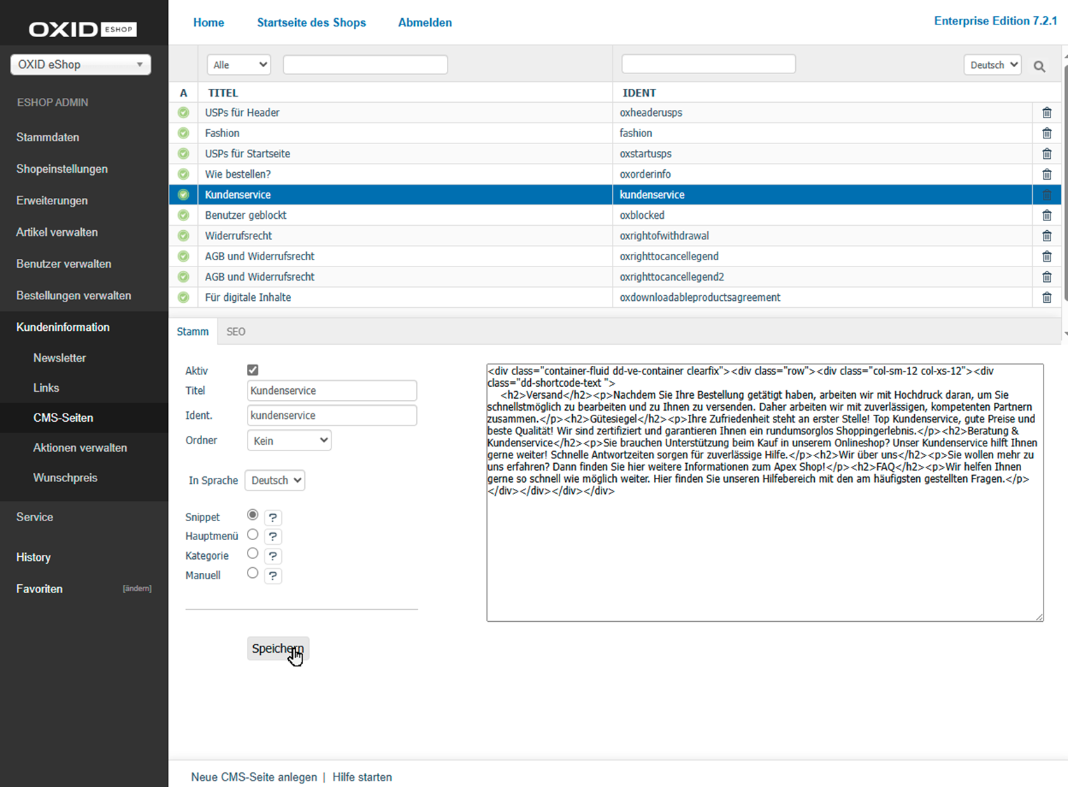 Pflegen Sie den Textinhalt der CMS-Seite im Editor auf der rechten Seite. Der Editor unterstützt WYSIWYG („What You See Is What You Get“) und zeigt den Text wie im Shop an.