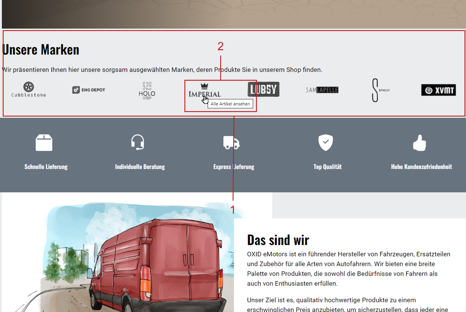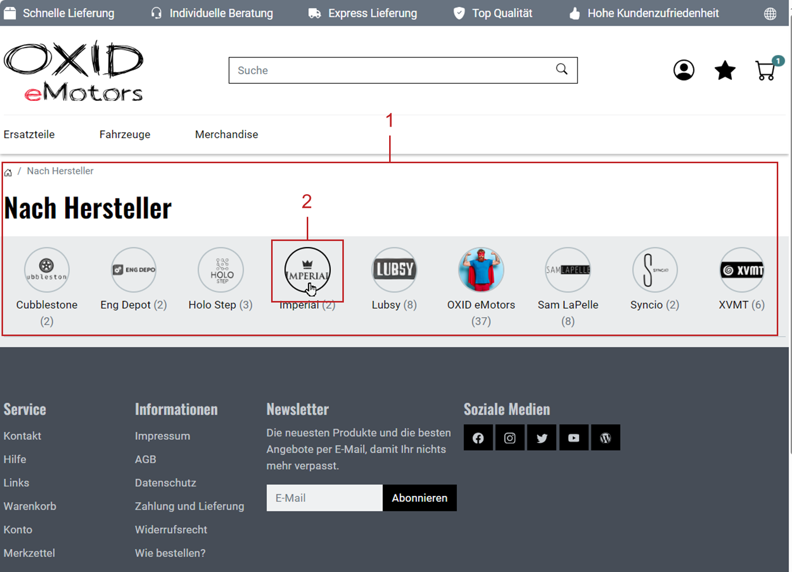Im Frontend erscheinen die Marken Ihres OXID eShops in einem Slider (Karussell, Markenleiste) (Abb.: Marken-Slider, Pos. 1).