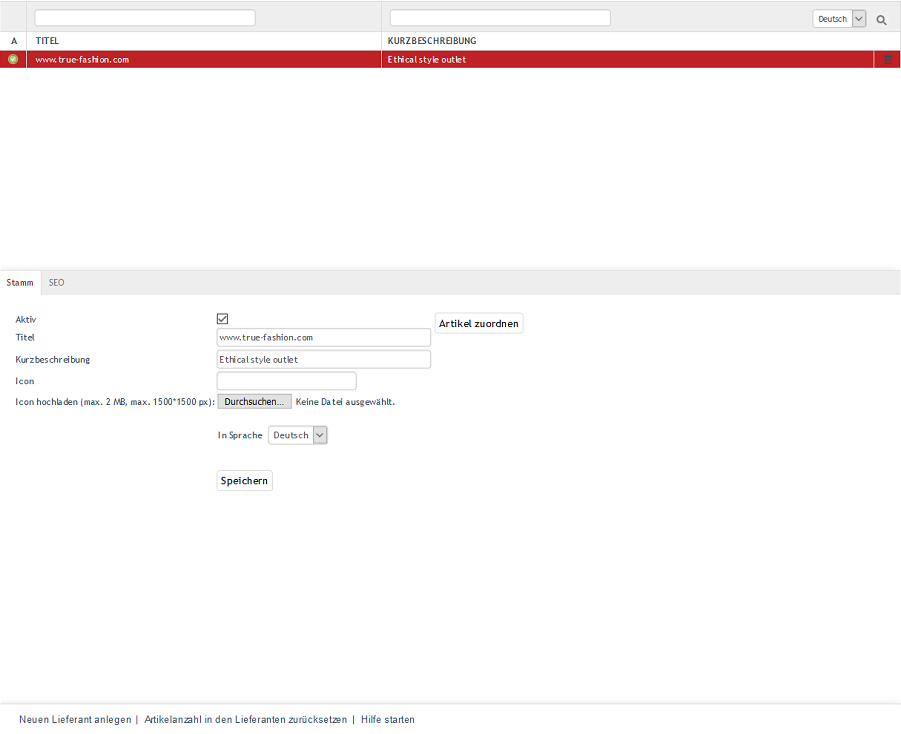 Inhalte: aktiver Lieferant, Titel, Kurzbeschreibung, Icon, Lieferantenlogo, Hochladen, Upload auf Webserver, automatisch generiert, Artikel zuordnen