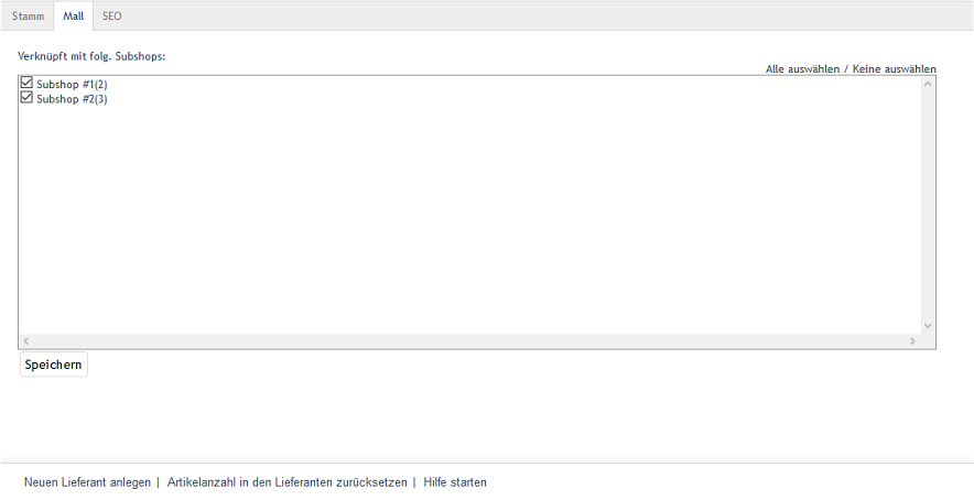 Über die Links Alle auswählen und Keine auswählen auf der rechten Seite des Fensters können alle Shops verknüpft oder alle Verknüpfungen zu den Shops entfernt werden. Vorgenommene Änderungen müssen gespeichert werden und sind für die Subshops oder Supershops sofort wirksam.