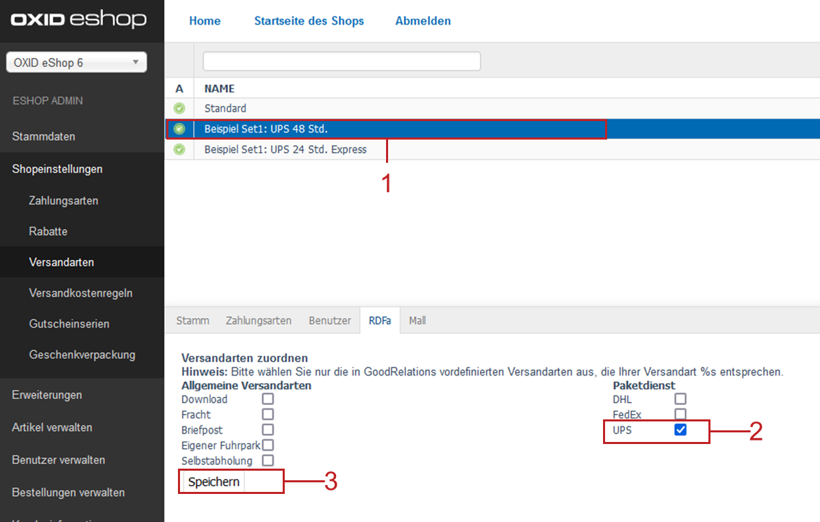 Legen Sie fest, welche RDFa-Daten für jede Versandart Ihres OXID eShops eingebettet werden soll.