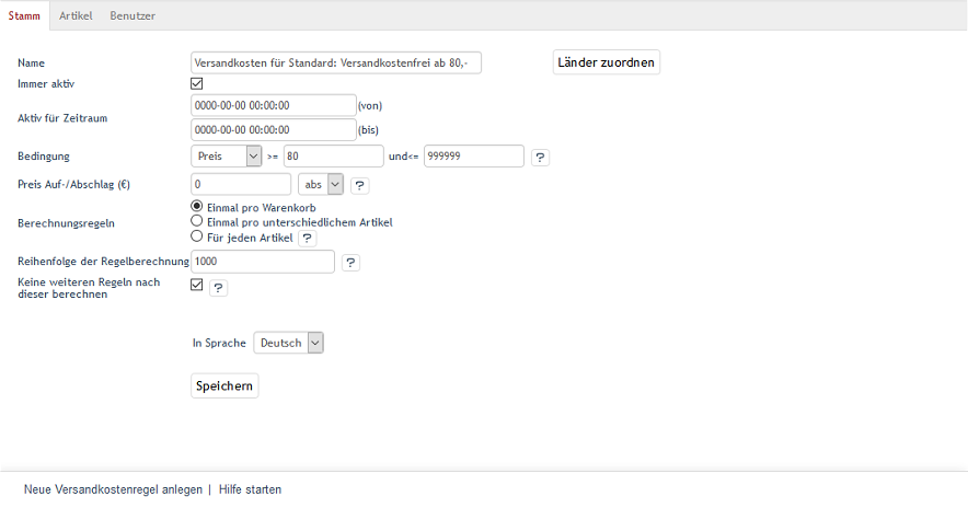 Dafür werden zwei Versandkostenregeln erstellt, deren Bedingung der Preis ist. Die eine ist für Artikel im Warenkorb mit einem Warenwert bis 79,99 €, die andere für Artikel ab 80 € Warenwert.