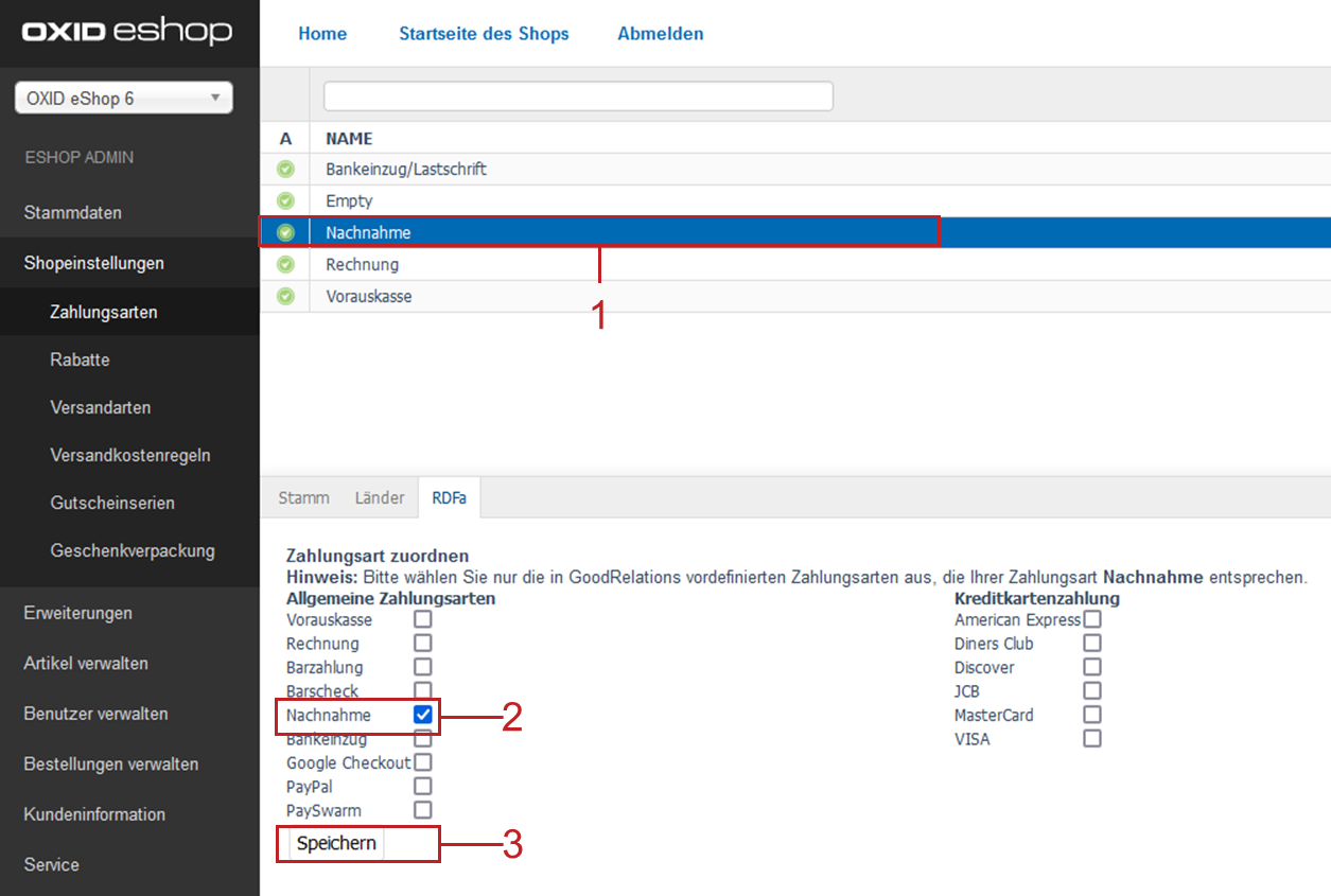 Legen Sie fest, welche RDFa-Daten für jede Zahlungsart Ihres OXID eShops eingebettet werden soll.