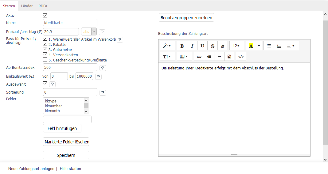 Die Registerkarte Stamm stellt verschiedene Einstellungen zur Verfügung, um die Zahlungsart individuell konfigurieren zu können. Die Zahlungsart kann hier beschrieben werden. Über einen Dialog erfolgt die Zuordnung der Benutzergruppen zur Zahlungsart.