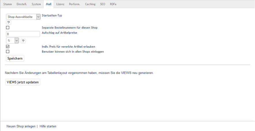 Der Shop, der bei der Installation des OXID eShop Enterprise Edition erstellt wird, ist ein spezieller Shop. Der Hauptshop vereinigt nicht nur verschiedene Shoptypen in sich, sondern stellt auch zwei Einstellmöglichkeiten bereit, die alle Shops betreffen. Die übrigen Einstellungen hingegen finden sich auf der Registerkarte Mall jedes Shops.