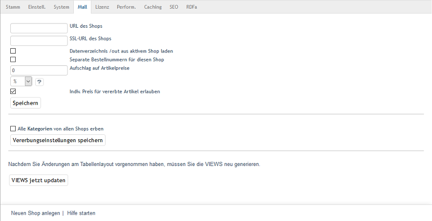 Unter Stammdaten ‣ Grundeinstellungen können auf der Registerkarte Mall für den Shop Einstellungen zur Mall-Funktion vorgenommen werden. Die Einstellmöglichkeiten sind für alle Shoptypen nahezu identisch. Nur für den Multishop gibt es die Möglichkeit, alle Kategorien aus allen Shops zu übernehmen. Wurden Artikel, Attribute, Auswahllisten sowie andere Elemente und Einstellungen von einem Elternshop geerbt, zeigt die Registerkarte auch die Vererbungseinstellungen an.