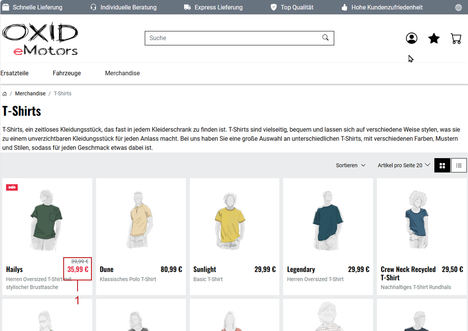 Ist der UVP, also die Herstellervorgabe, größer als der Artikelpreis, wird in der Detailansicht des Artikels die normale Preisangabe mit durchgestrichenem UVP ergänzt (Abb.: Durchgestrichener UVP, Pos. 1).