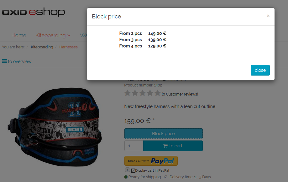 In OXID eShop, the scale prices are displayed on the product’s details page when the customer clicks on the Block Price button. The system applies the corresponding scale price in the shopping cart based on the quantity entered at the time of purchase and displays it.