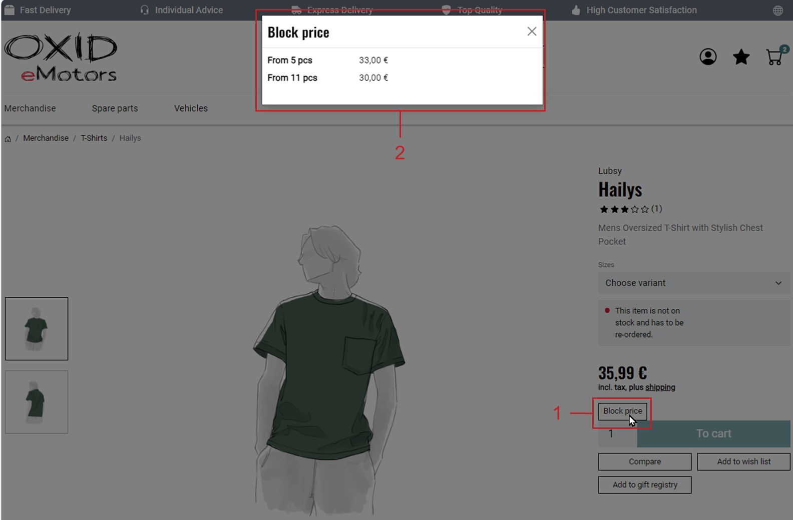 In OXID eShop, scale prices are displayed on the product detail page (Fig.: Displaying scale prices, item 2) when the customer selects the Block price button (Fig.: Displaying scale prices, item 1).