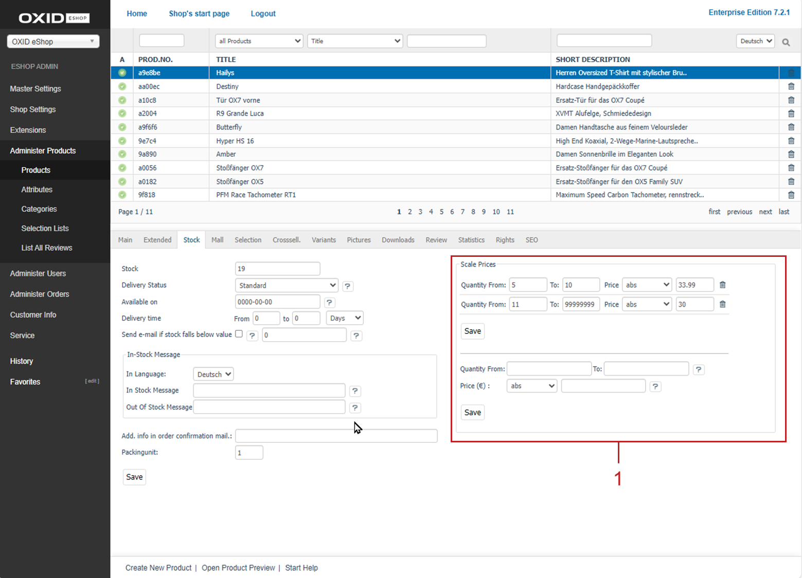 In the Stock tab, under Scale Prices, enter a quantity range and the corresponding price (Fig.: Defining scale prices, item 1).