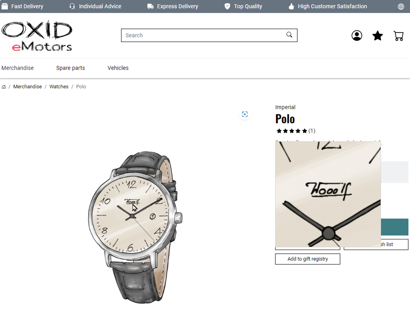 Items have zoom images that can also be called up on the detail page. Specify globally or at category level or for individual products which type of zoom you want to use.