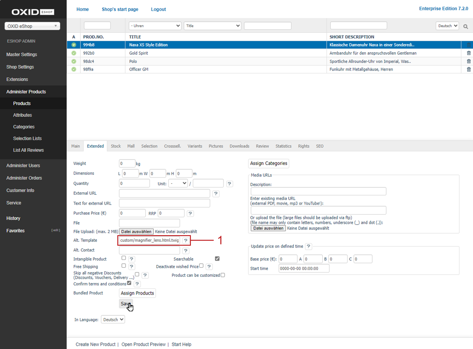 Set the desired zoom by entering the path of the corresponding template in the Alternative Template input field (in our example, defining the magnifyer zoom type, Fig.: Defining an alternative template for a product, Pos. 1).