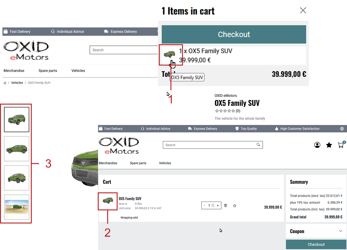 in the shopping cart preview (minibasket) (Fig.: Icon in various functions, item 1)