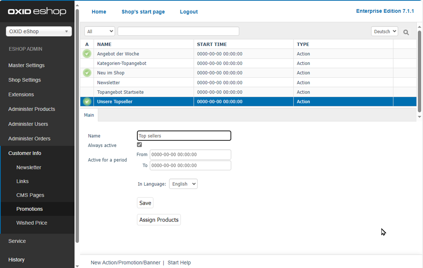 However, the promotions “Category top offer” and “Top offer homepage” are available in the administration area (Fig.: Managing promotions) because the theme “Azure” uses them. If required, you can integrate them into a theme based on “Flow”.
