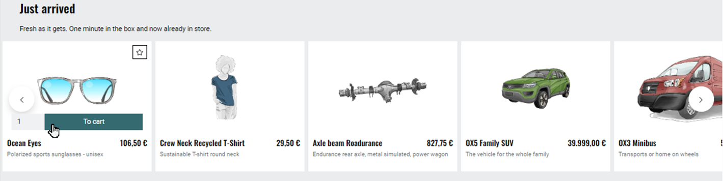 The start page presents articles as new arrivals in the store with a slider overview (Fig.: Promotion type Freshly arrived).