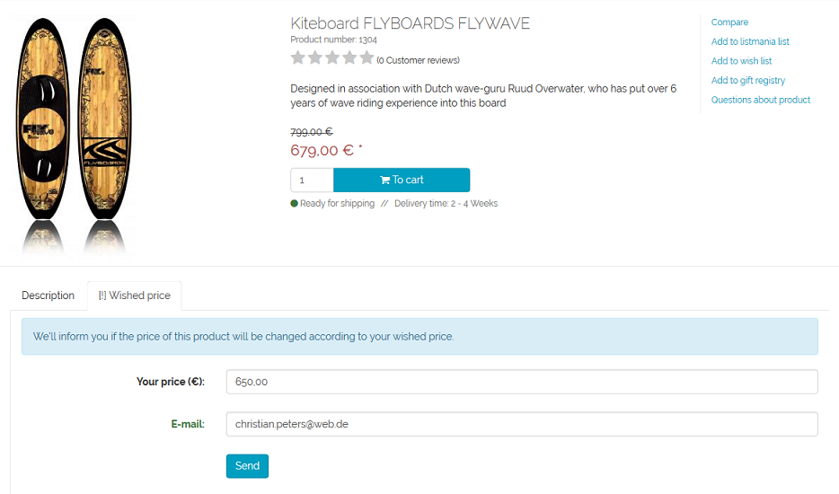 The requested price feature allows customers to enter a price at which they would like to buy a product. If this price is reached or undercut, the customer can receive an automatic email notification.