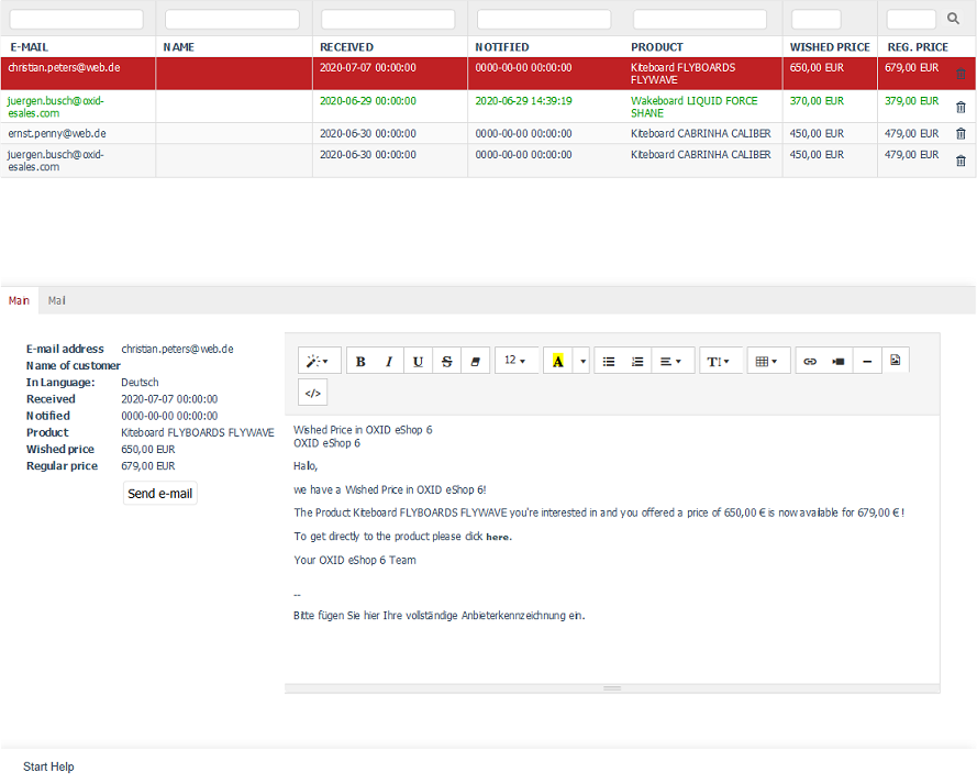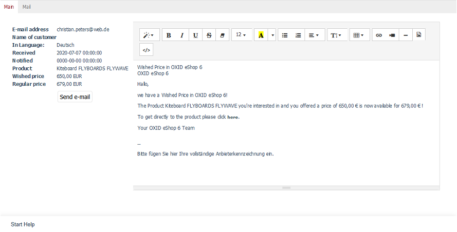 When the Email tab is opened, the shop automatically checks all open requested price entries. If the desired price for a product has been reached or undercut, this is displayed.