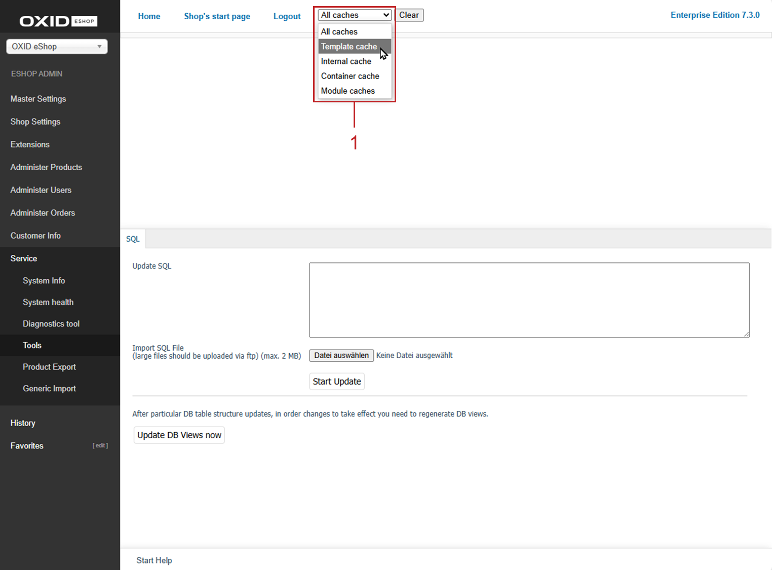 If the message “Cache clear failure” appears, try triggering the cache clearing again. If the issue persists, investigate the cause. If a module or other component is responsible, report the issue to OXID Support or Product Marketing. Suggestions for improvement are welcome.