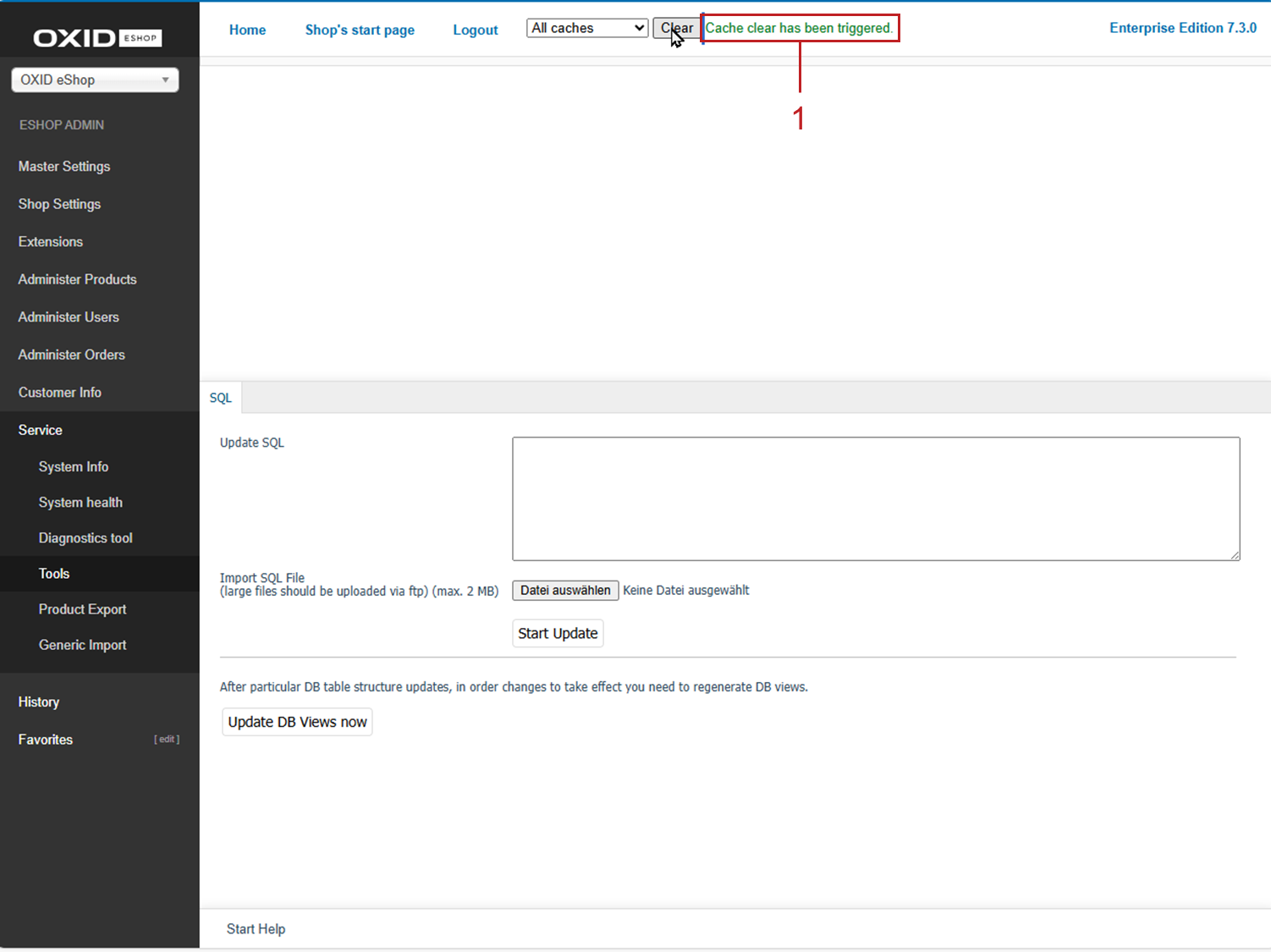 A message appears indicating that cache clearing has been triggered via the shop logic (Fig.: Clearing the cache: Result, item 1).