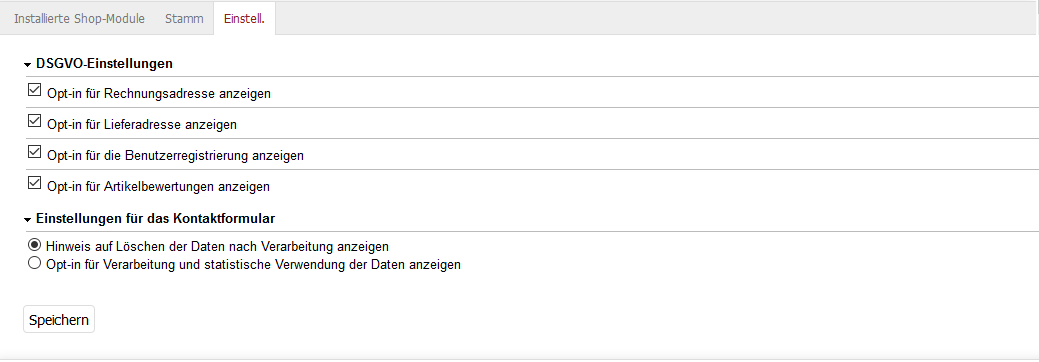 Die Funktionen des Moduls lassen sich in dessen Einstellungen aktivieren bzw. deaktivieren. Gehen Sie dafür im Administrationsbereich zu und wählen Sie das Modul GDPR Opt-in aus der Liste der Module. Sie finden die Einstellungen auf der Registerkarte Einstell.