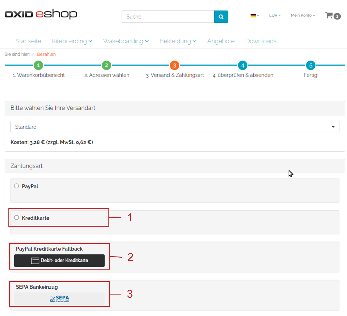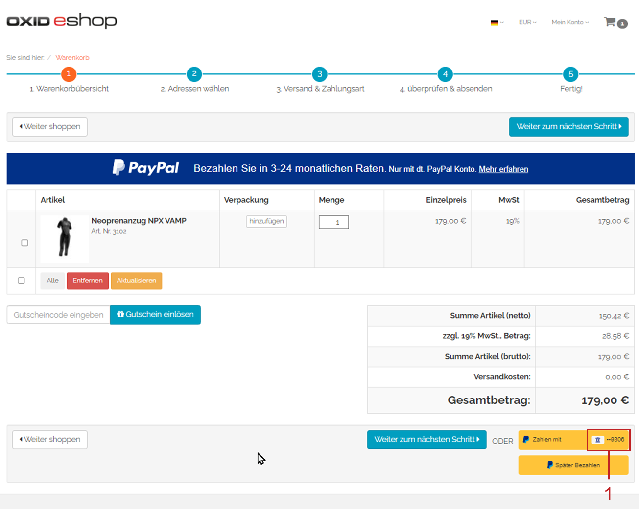 Das beschleunigt bei Stammkunden die Kaufabwicklung und erhöht die Benutzerfreundlichkeit Ihres OXID eShops. Die Schaltfläche zum Bezahlen ist entsprechend gekennzeichnet (Abb.: Mit gespeicherter Zahlungsart zahlen, Pos. 1).