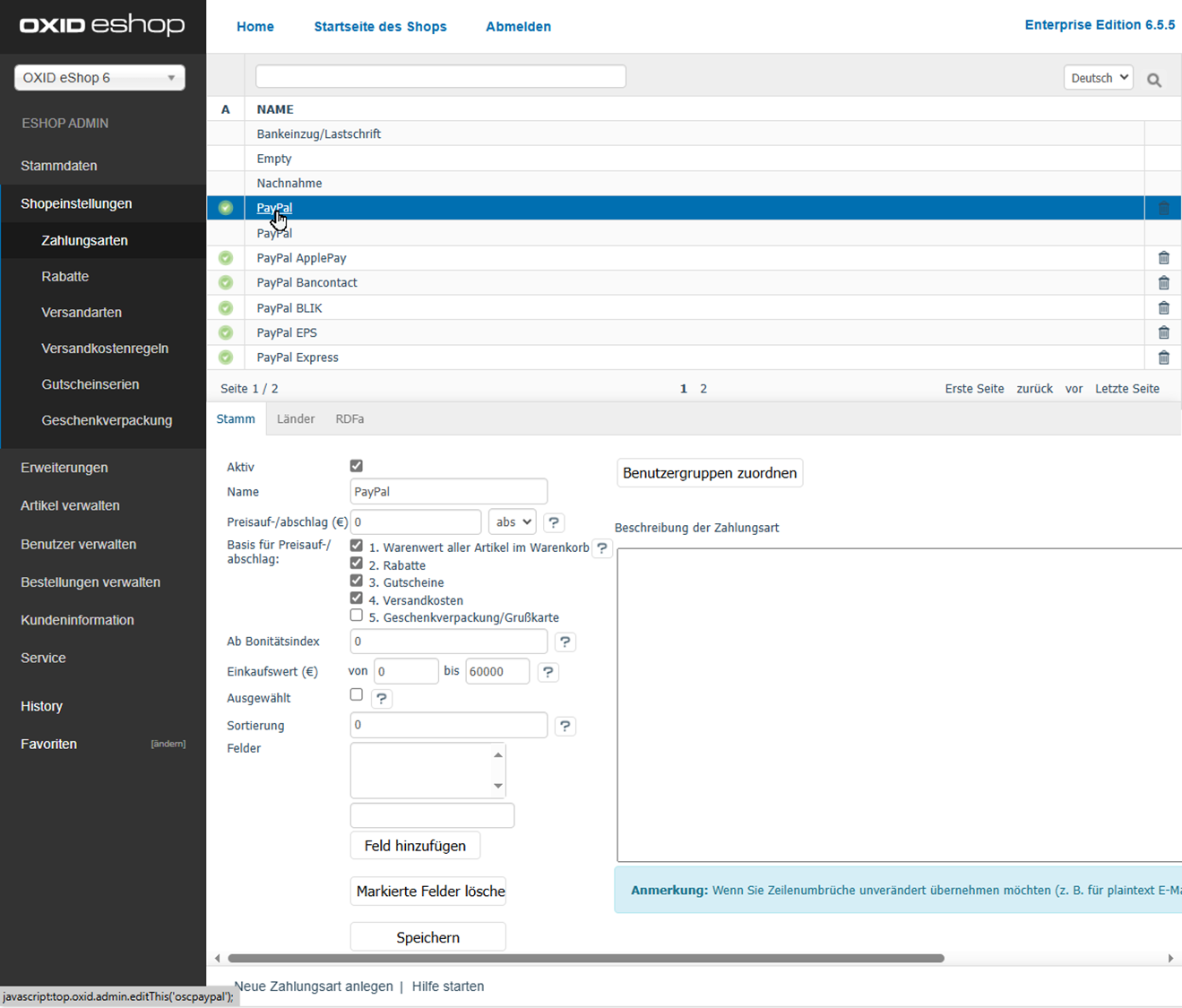 Unter sind die Zahlungsarten PayPal sowie wichtige weitere Zahlungsarten als aktiv gekennzeichnet.