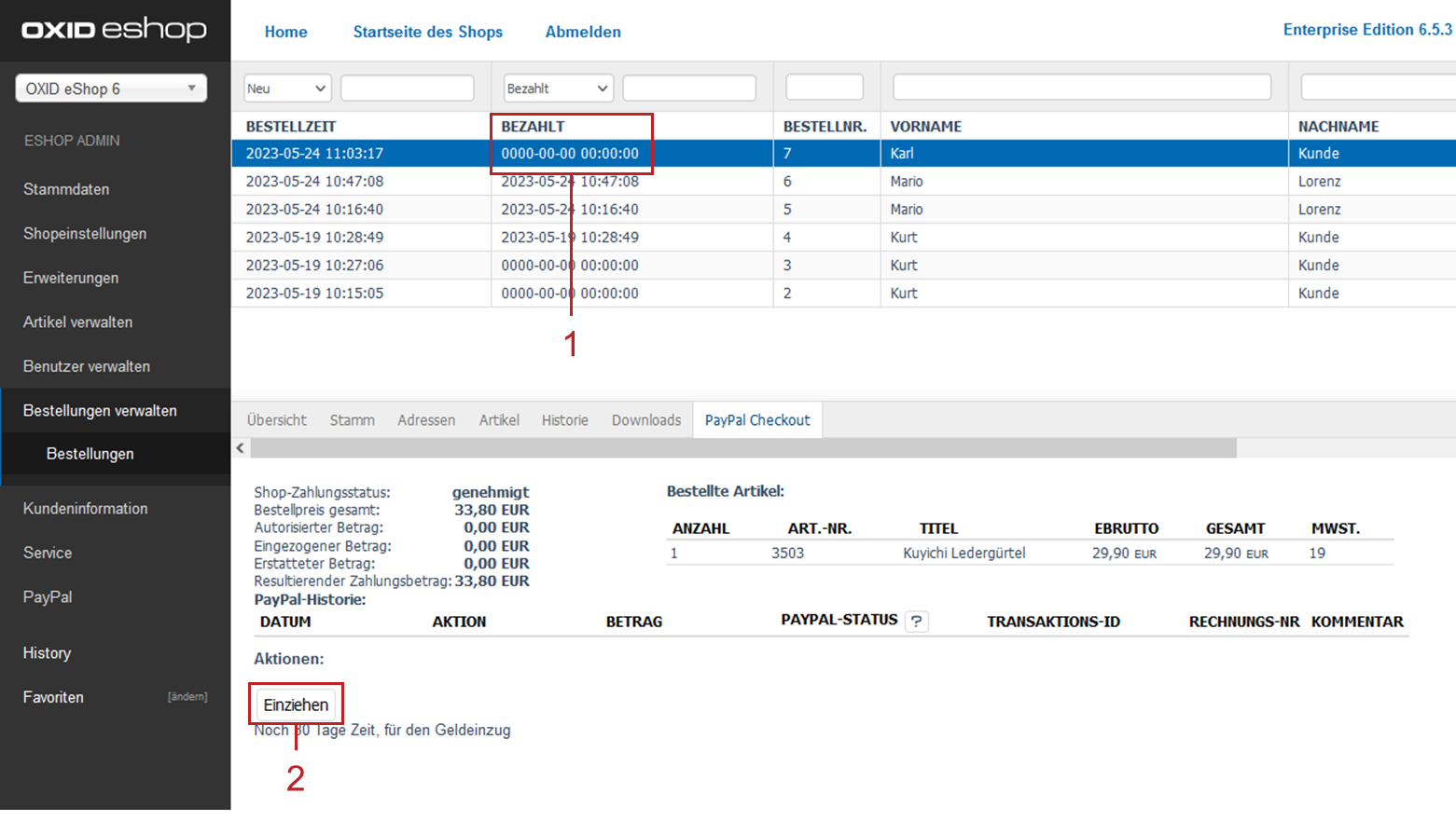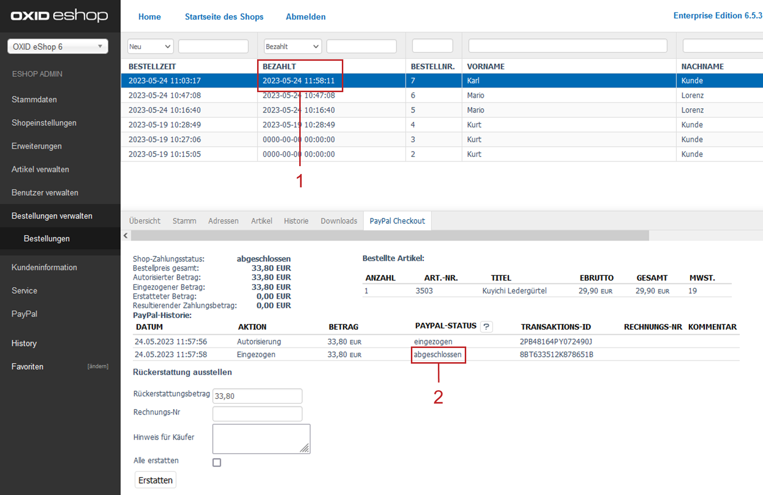 Mit der nächsten Aktualisierung der Seite ist die Bestellung in der Liste der Bestellungen als bezahlt markiert (Abb.: Reservierte Zahlung: PayPal-Status prüfen, Pos. 1).
