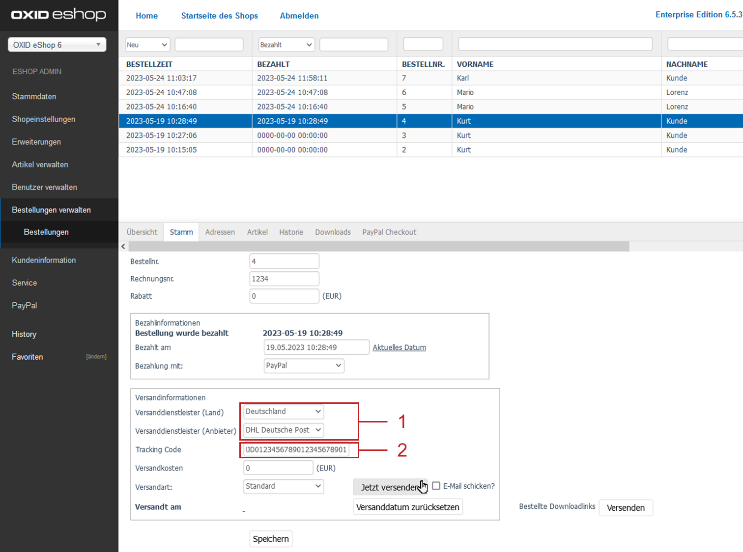 Erfassen Sie auf der Registerkarte Stamm wie gewohnt den Tracking Code im gleichnamigen Eingabefeld (Abb.: Tracking-Code und Versanddienstleister-Daten an PayPal senden, Pos. 2).