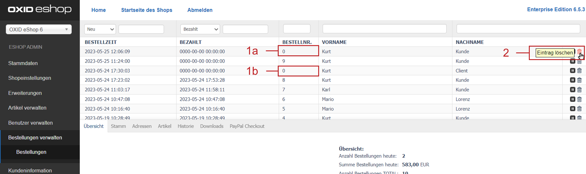 Unabgeschlossene Bestellungen haben die Bestellnummer 0 (Abb.: Unvollständige Bestellungen manuell löschen, Pos. 1a, Pos. 1b).
