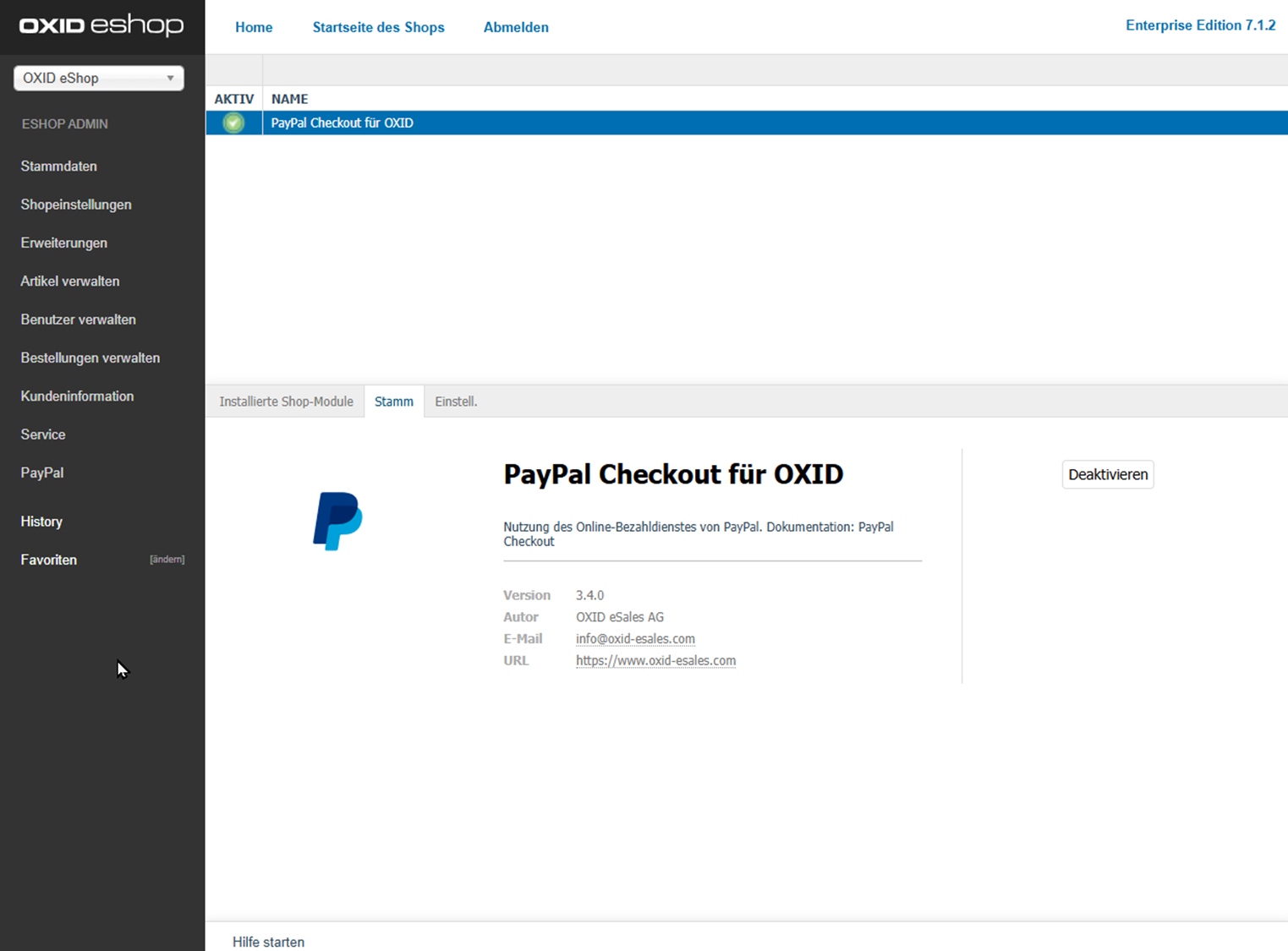 Abb.: PayPal Checkout für OXID installiert und aktiviert