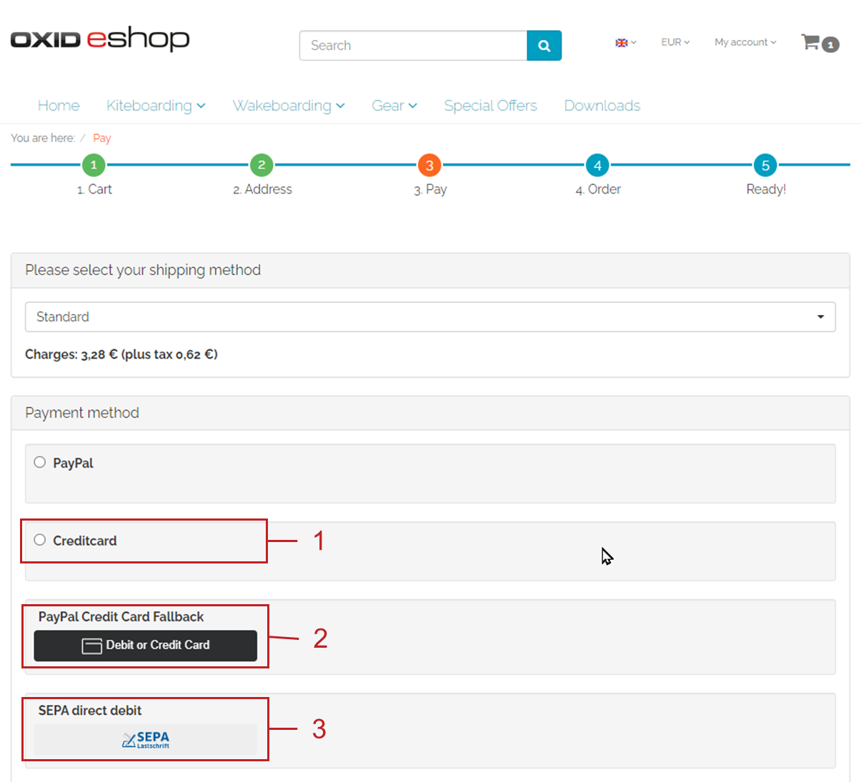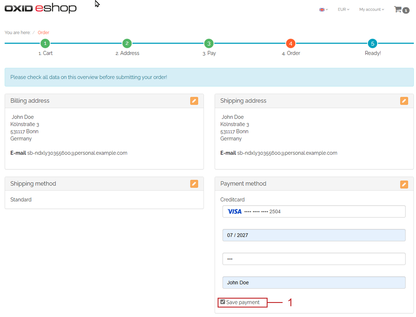 This speeds up the checkout process for regular customers and increases the user-friendliness of your OXID eShop. The payment button is labeled accordingly (Fig.: Paying with saved payment method, item 1).
